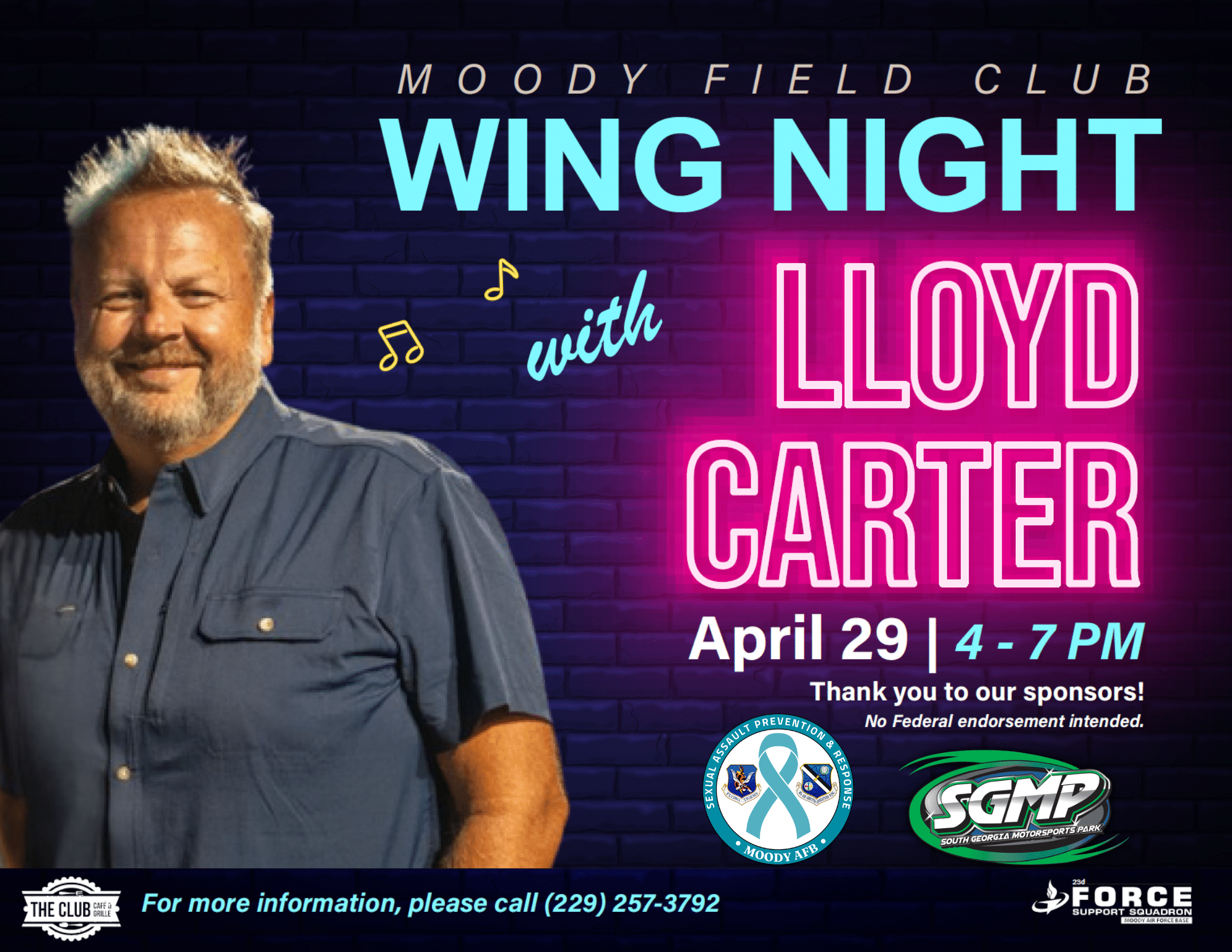 Join us every Wednesday at the Moody Field Club for a wing-tastic time! Enjoy 90¢ wings with 11 sauces to choose from! Sauces: Hot Mild BBQ Cajun Honey Mustard Teriyaki […]